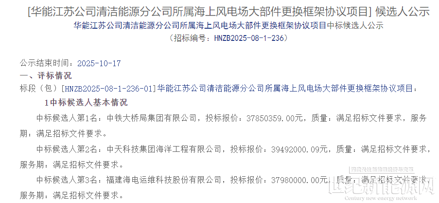 今日,华能江苏公司清洁能源分公司所属海上风电场大部件更换框架协议项目候选人公示。