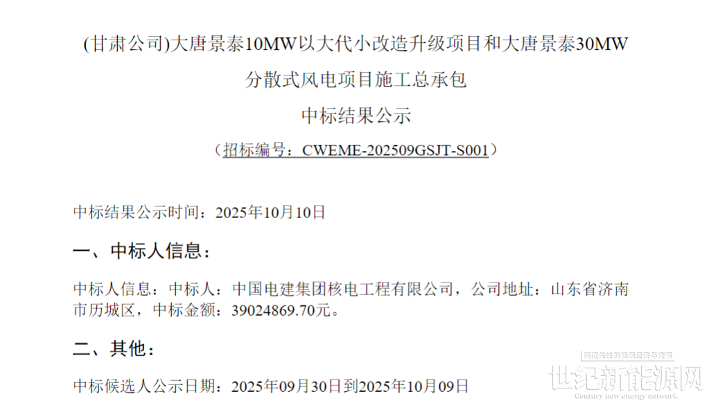 【(甘肃公司)大唐景泰10MW以大代小改造升级项目和大唐景泰30MW分散式风电项目施工总承包】中标结果公示