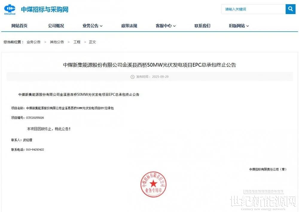 日前,中煤新集能源股份有限公司金溪县西桥50MW光伏发电项目EPC总承包终止公告发布。