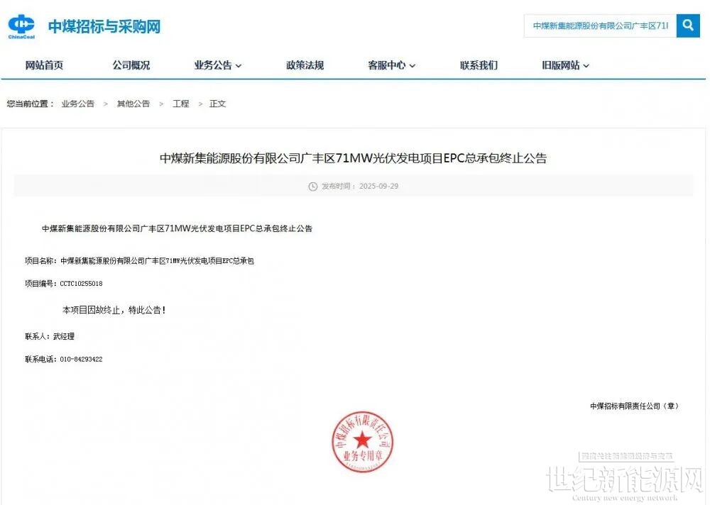 公告显示,中煤新集能源股份有限公司广丰区71MW光伏发电项目EPC总承包因故终止。