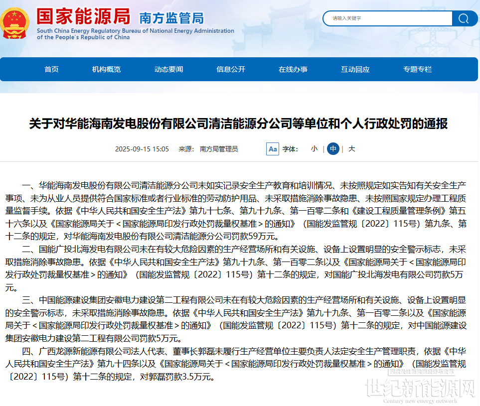 日前,国家能源局南方监管局发布关于对华能海南发电股份有限公司清洁能源分公司、国能广投北海发电有限公司、中国能源建设集团安徽电力建设第二工程有限公司以及广西龙源新能源有限公司等单位和个人行政处罚的通报。