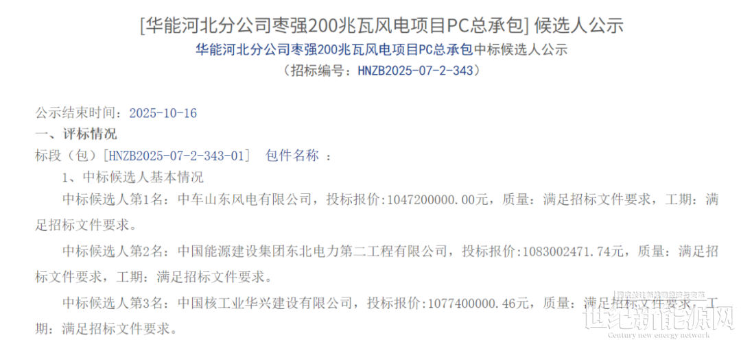 公告显示,第一中标候选人:中车山东风电有限公司,投标报价:1047200000.00元。第二中标候选人:中国能源建设集团东北电力第二工程有限公司,投标报价:1083002471.74元。第三中标候选人:中国核工业华兴建设有限公司,投标报价:1077400000.46元。