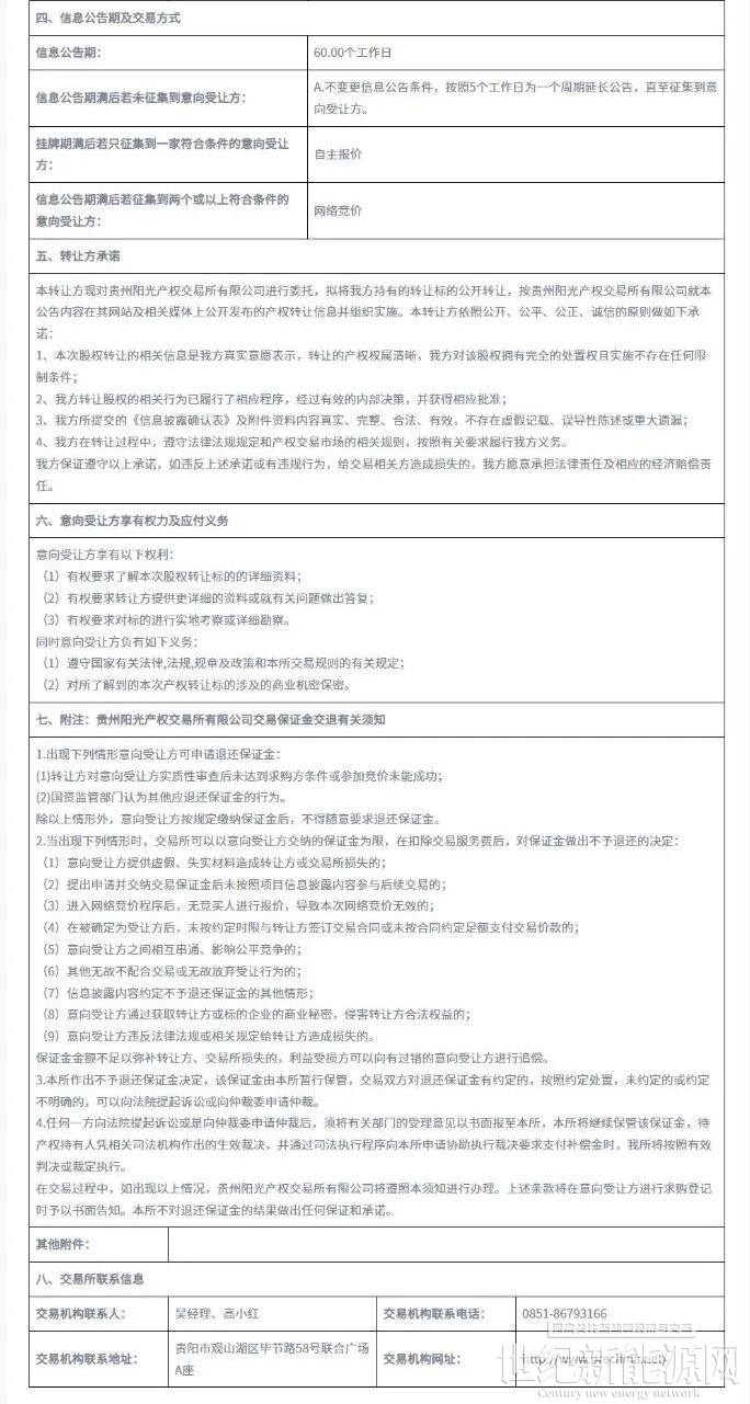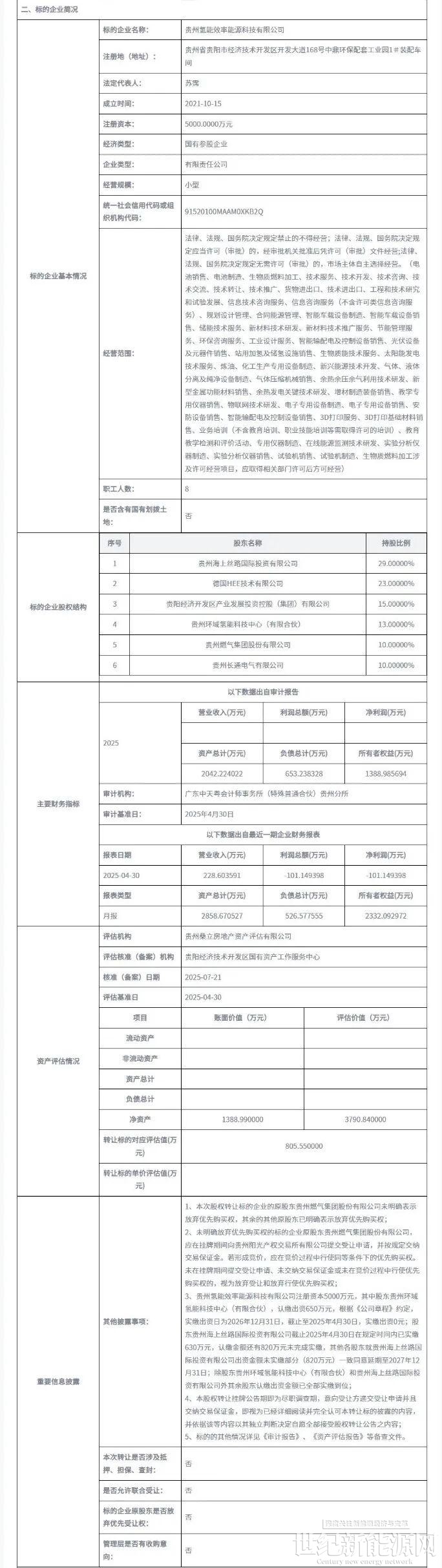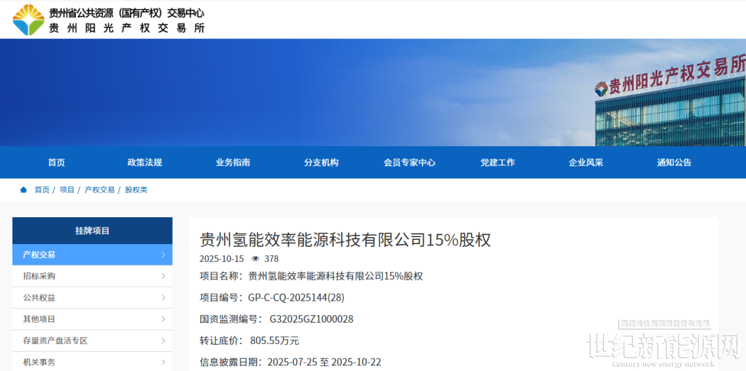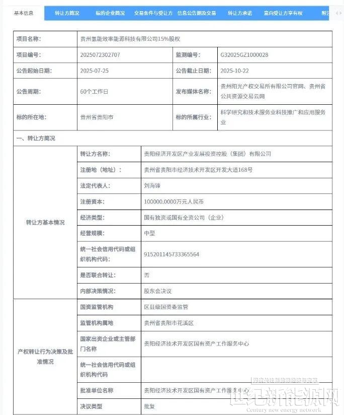 10月15日,贵州阳光产权交易所发布贵州氢能效率能源科技有限公司15%股权转让信息,转让底价 805.55万元,转让方为贵阳经济开发区产业发展投资控股(集团)有限公司。