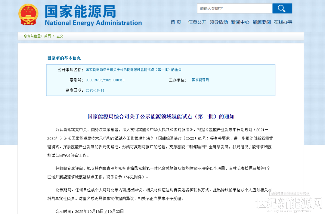 10月16日,国家能源局综合司关于公示能源领域氢能试点(第一批)的通知。