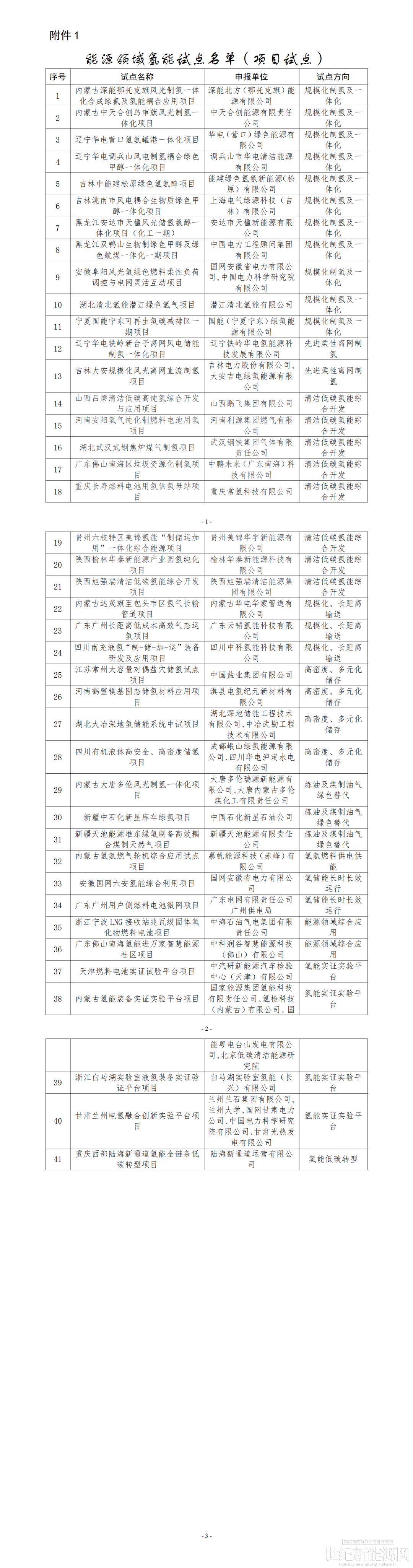 1.能源领域氢能试点名单(项目试点)