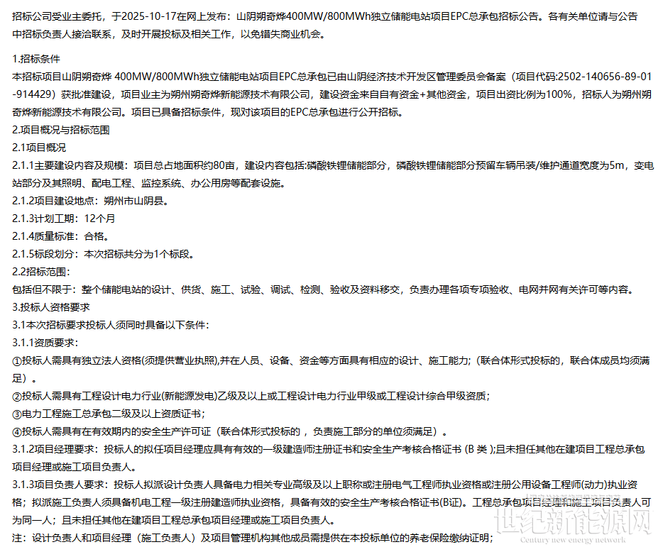 山阴朔奇烨400MW/800MWh独立储能电站项目EPC总承包招标公告