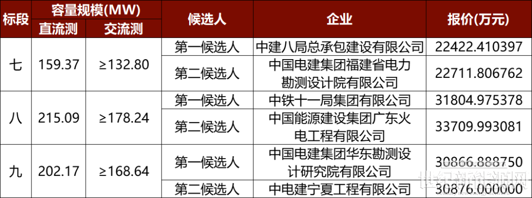 10月14日,宁夏电力国能红寺堡新能源有限公司“宁湘直流”配套红寺堡150万千瓦新能源基地项目EPC工程(七标段、八标段、九标段)公开招标中标候选人公示,中建八局总承包建设有限公司、中铁十一局集团有限公司、中国电建集团华东勘测设计研究院有限公司分别位列三个标段第一候选人。