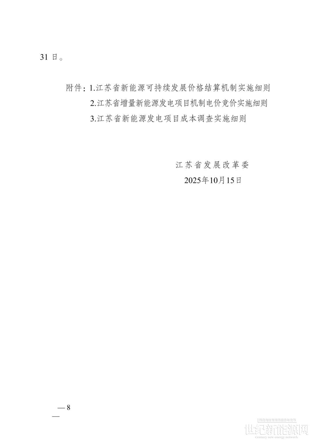 10月17日,江苏省发改委发布关于印发《关于江苏省深化新能源上网电价市场化改革促进新能源高质量发展实施方案》的通知,方案自2026年1月1日起执行,有效期五年。