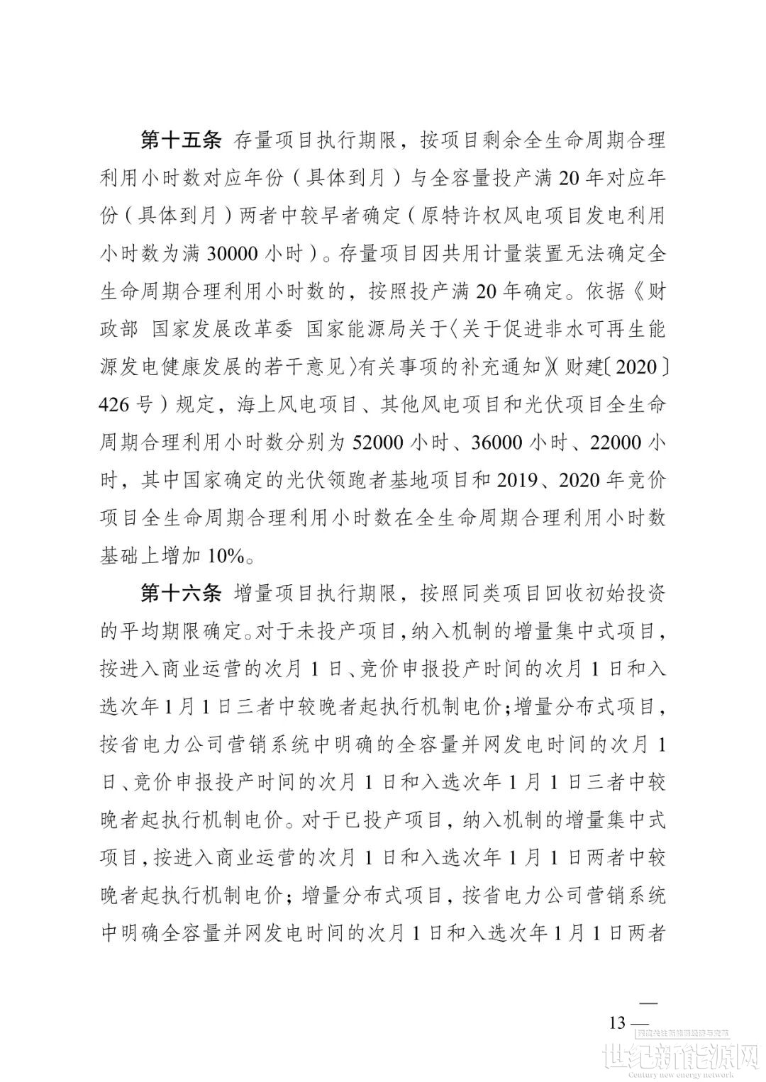 按项目剩余全生命周期合理利用小时数对应年份与全容量投产满20年对应年份较早者确定(原特许权风电项目投产发电利用小时数为满30000小时)。到期后,存量项目不再执行机制电价。