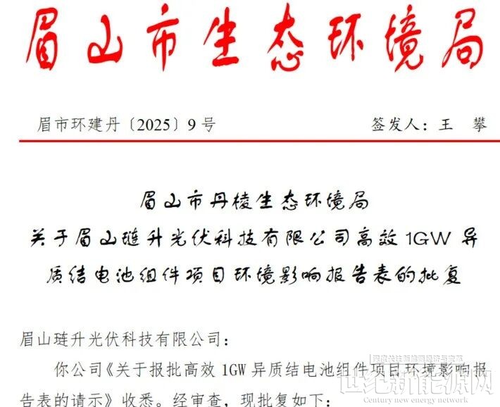10月16日,四川省眉山市丹棱县人民政府官网显示,丹棱县生态环境局发布“眉山琏升光伏科技有限公司高效1GW异质结电池组件项目环境影响报告表的批复”公告。