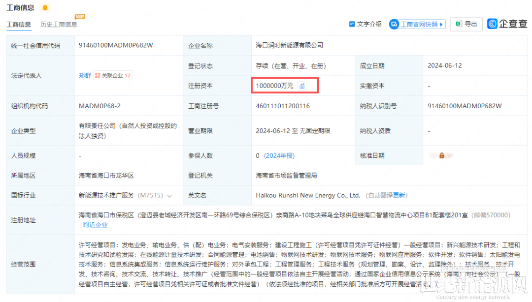 公开资料显示,海口润时新能源有限公司成立于2024年6月12日,此前注册资本241万元,经营范围包括发输配电业务、新兴能源技术研发、合同能源管理、电池销售、物联网技术研发应用等,该公司由宁德时代全资持股。此次增资被视为宁德时代在零碳电网方面的又一重磅布局。