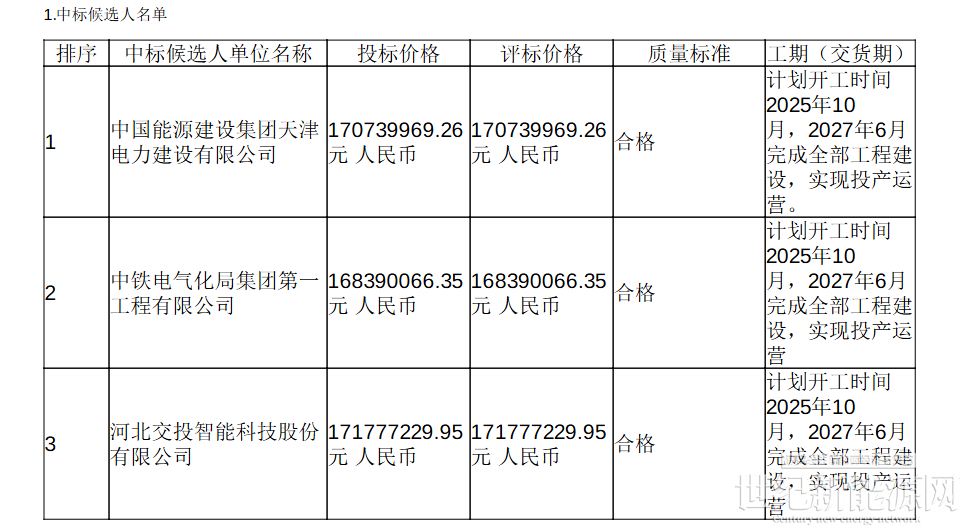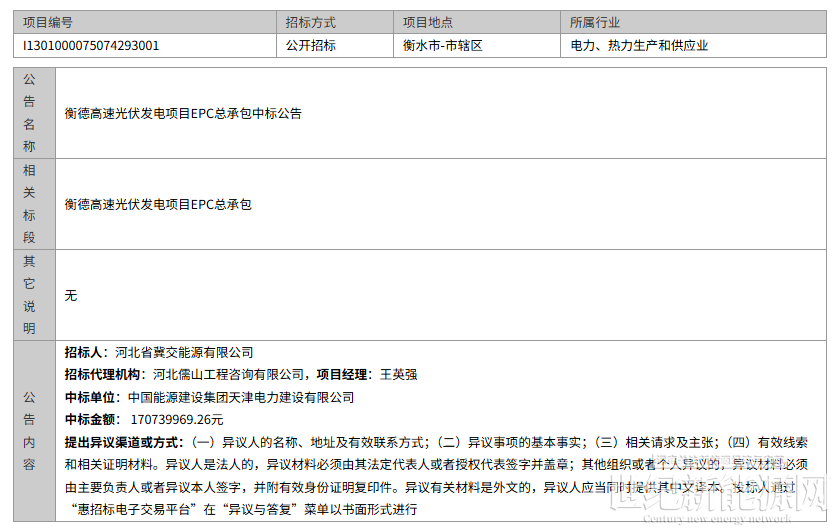 10月20日,衡德高速光伏发电项目EPC总承包中标公告发布,其中,招标人为河北省冀交能源有限公司,中标单位为中国能源建设集团天津电力建设有限公司,中标金额为170739969.26元。