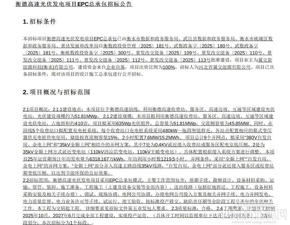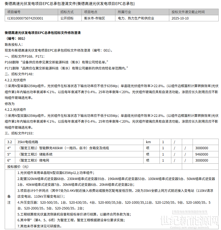 根据公开招标公告显示,该项目9月12日发布招标公告,9月24日曾发布衡德高速光伏发电项目EPC总承包澄清文件(衡德高速光伏发电项目EPC总承包),修改澄清部分内容,10月14日发布中标候选人名单: