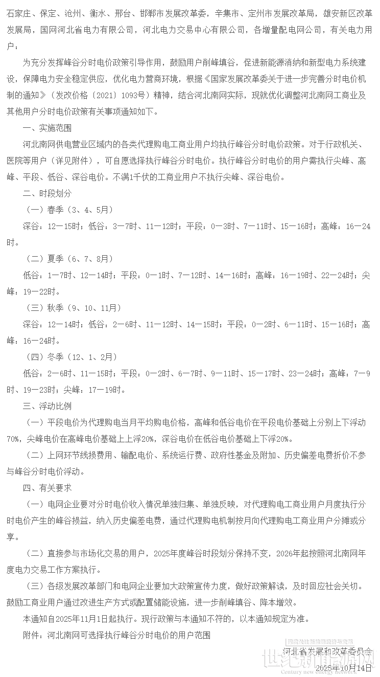 10月14日,河北省发改委发布《关于优化调整河北南网工商业及其他用户分时电价政策》的通知,本通知自2025年11月1日起执行。