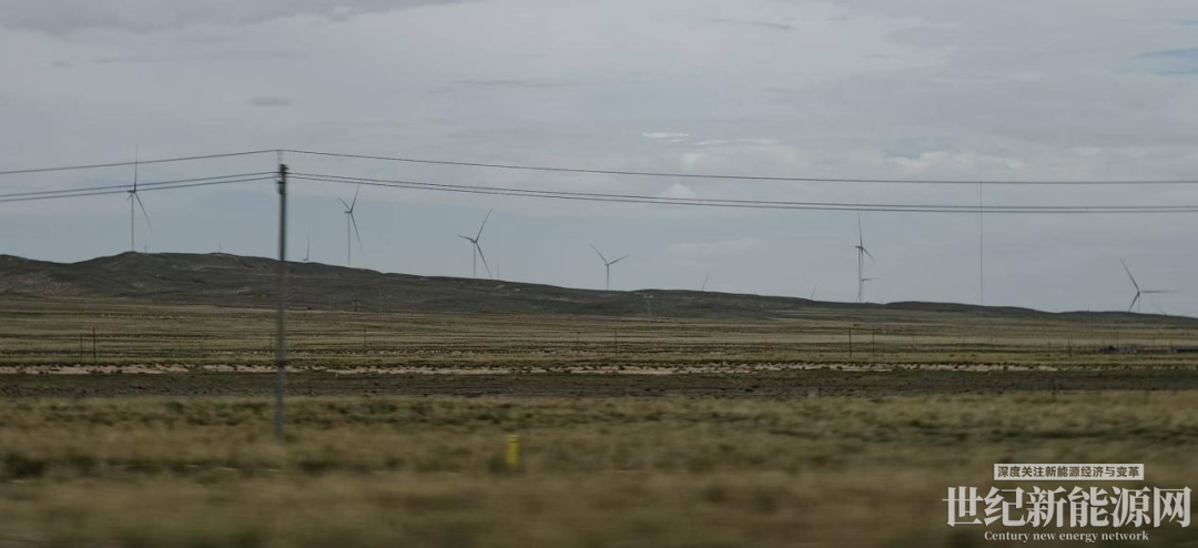 接下来,再次踏上行程,前往倒湖茶公路的“终点”茶卡盐湖。在倒湖茶公路与京藏高速交会处附近,在远山的那边,一个个风力发电机又出现在视野中,稍近一些的,能够看到过半“身高”,稍远一些的,只露出一部分叶片。随着汽车不断前行,风机的身影也越来越靠近。