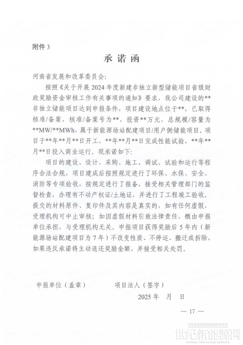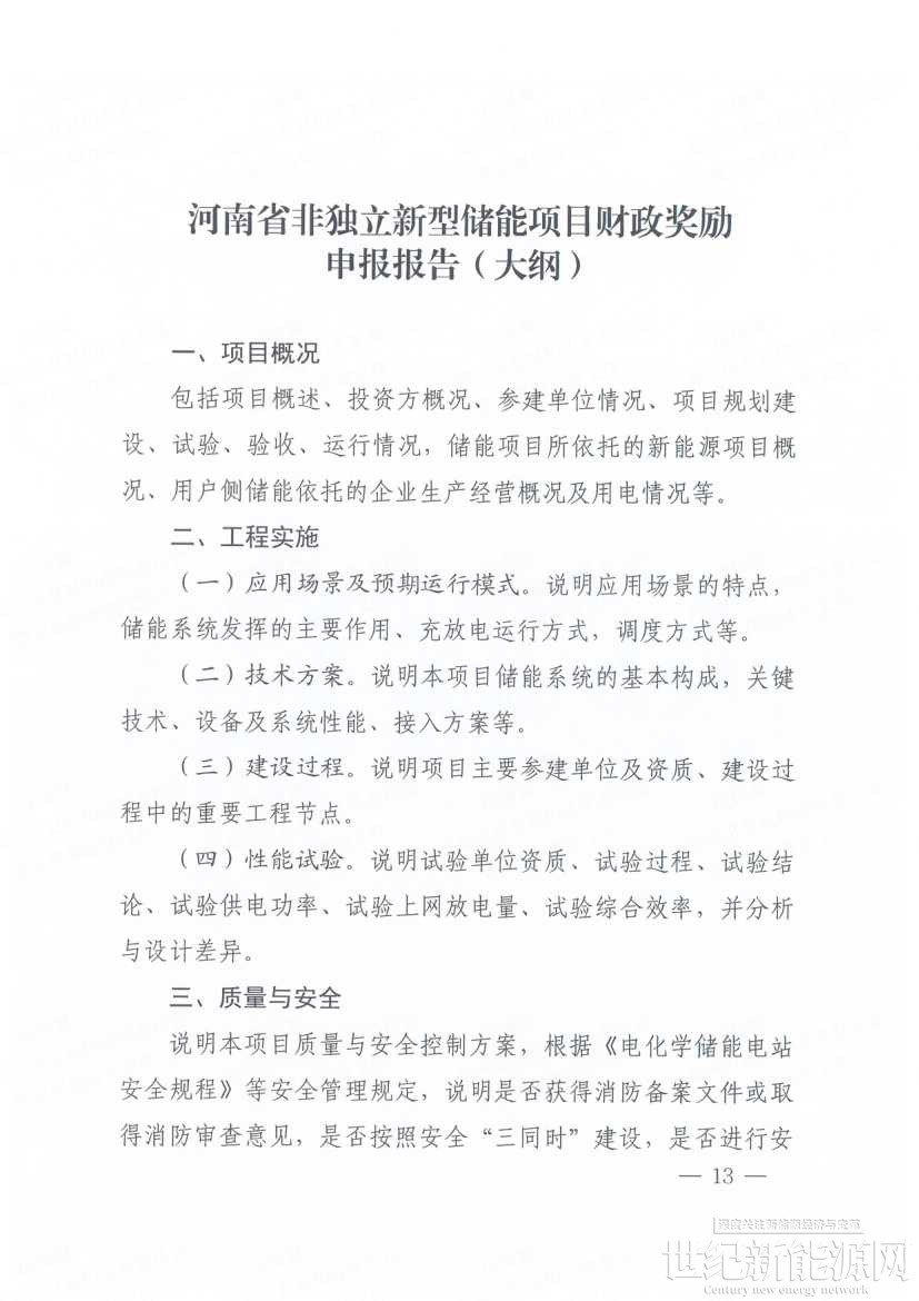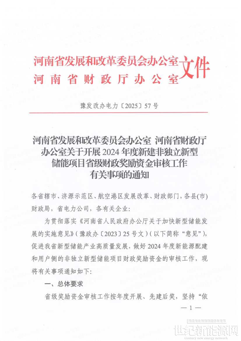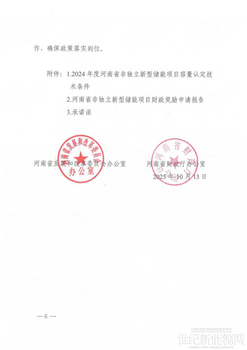 10月20日,河南郑州高新技术产业开发区管理委员会下发《关于开展2024年度新建非独立新型储能项目省级财政奖励资金审核工作有关事项的通知》,对全省区域内新建设容量在1000千瓦时以上的新能源项目配建、用户侧非独立储能项目,奖励容量按照交流侧并入系统容量确定(技术认定条件见附件1),项目投运日期在2024年1月1日~2024年12月31日,按照《意见》要求,2024年度新型储能奖励标准为120元/千瓦时。