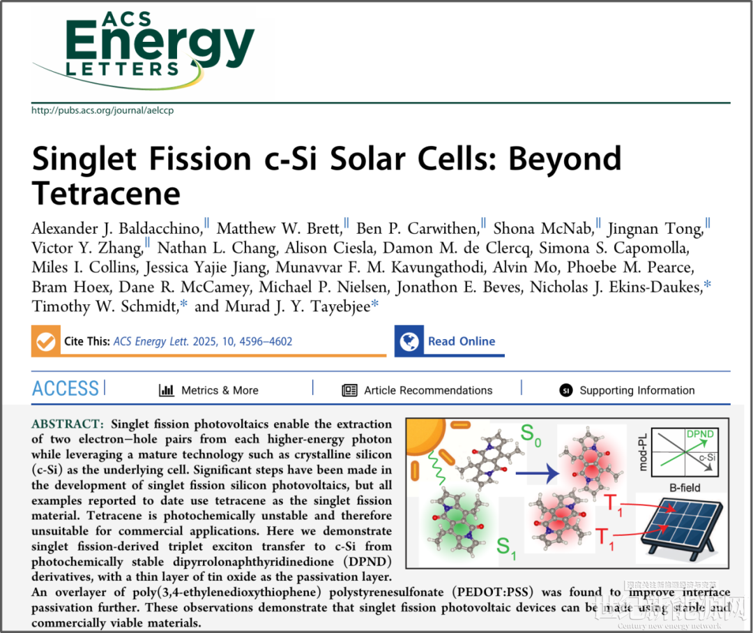 2025 年 10 月,一道新能与澳大利亚新南威尔士大学(UNSW)光伏研究中心联合研究效率可达40%高效电池项目--基于单线态分裂的多光子高效太阳电池(Singlet Fission on Silicon,简称SFOS)研究取得关键突破,UNSW团队发现了性能稳定、量子产率高、与硅具有良好能带匹配的新型单线态分裂材料DPND,相关研究成果已发表于国际能源领域顶级学术期刊《ACS Energy Letters》。此次成果的发表标志着多光子 SFOS 高效太阳电池基础研究获得重大突破,为后续在硅上制备高效多光子SFOS 太阳电池产业化奠定了重要基础。