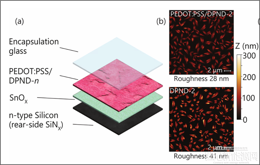 但传统单线态分裂材料(如并四苯)存在单线态裂变量子产率低、光化学稳定性差的问题,因此,研发新型高效稳定的单线态分裂材料成为SFOS电池突破的关键所在。UNSW团队成功研发的二吡咯并萘啶二酮(DPND)薄膜与SnOₓ/PEDOT:PSS双层钝化结构结合,解决了材料稳定性和界面钝化两大关键问题。DPND具有高的稳定性,与硅具有良好的能带匹配,量子产率超过170%,能够实现单线态分裂产生的多激子向硅基衬底的高效转移。