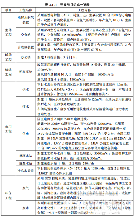 建设内容:建设年产 10 万吨绿氢制 60 万吨绿氨生产线。总建筑面积91114.8m2,主要建设电解水制氢厂房、库房、业务用房、管理用房等;购置安装电解水制氢装置、气液分离装置、纯化装置、空分制氮装置、合成氨装置等设备;配套建设罐区及装卸站、脱盐水站、循环水站、污水处理站、供排水、道路、硬化、绿化、消防等附属设施。
