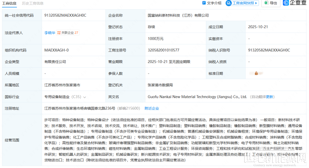 10月21日,国富纳科新材料科技(江苏)有限公司,注册资本1000万元,法定代表人李晓华。