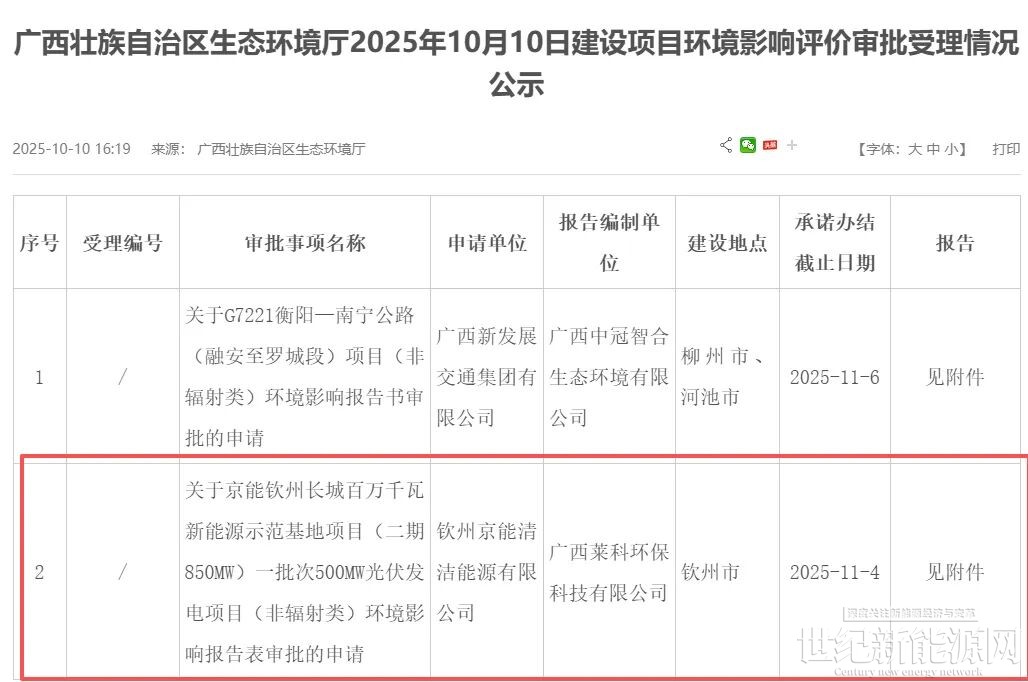 10月10日,广西生态环境厅发布2个建设项目环境影响评价审批受理情况公示,其中包含了京能钦州长城百万千瓦新能源示范基地项目(二期850MW)一批次500MW光伏发电项目,申请单位为钦州京能清洁能源有限公司。
