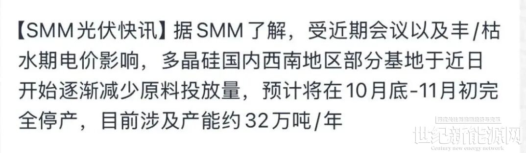 据SMM最新消息,西南地区部分多晶硅生产基地因丰枯水期电价调整及行业政策导向启动减产,预计10月底至11月初实现完全停产,涉及年产能约32万吨。这一规模占国内当前350万吨有效产能的9.14%-10.7%,也就是十分之一左右,而此消息也引发了市场广泛关注。