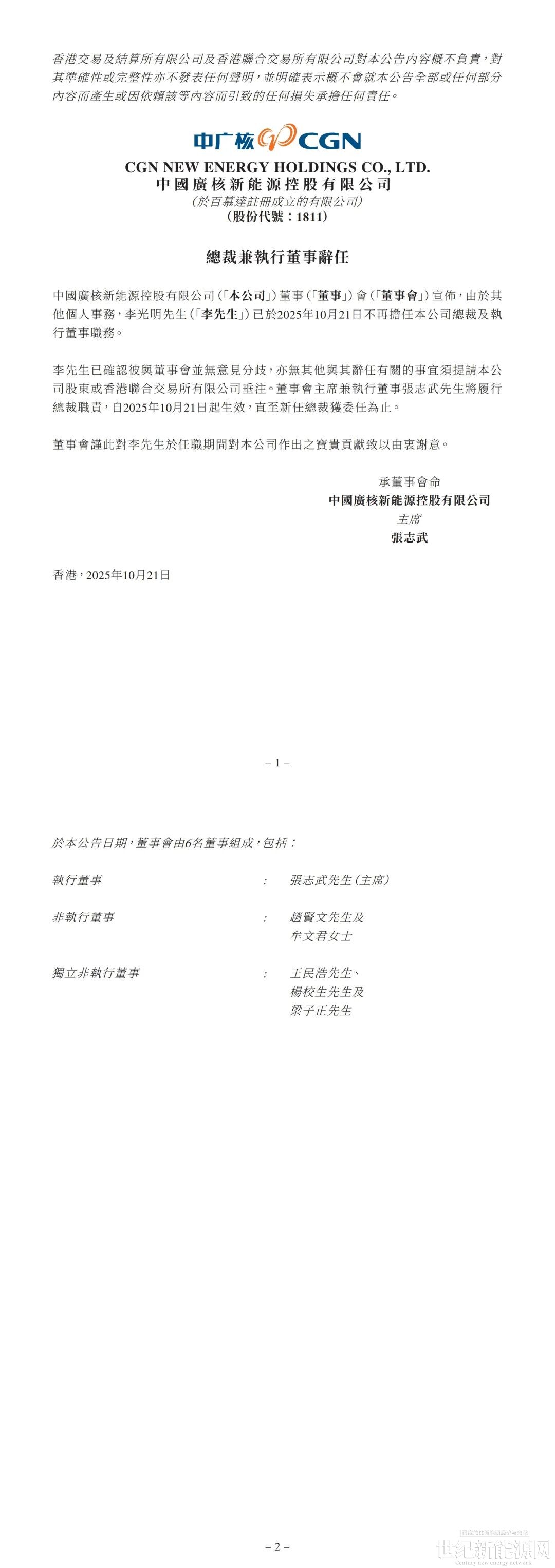中国广核新能源控股有限公司董事会宣布,由于其他个人事务,李光明先生于2025年10月21日不再担任公司总裁及执行董事职务。