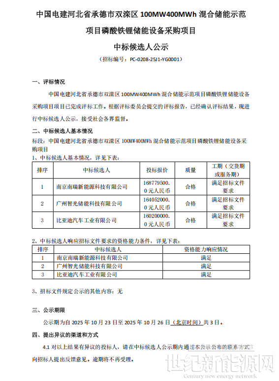 10月23日,中国电建河北省承德市双滦区100MW/400MWh混合储能示范项目磷酸铁锂储能设备采购项目中标候选人公示。