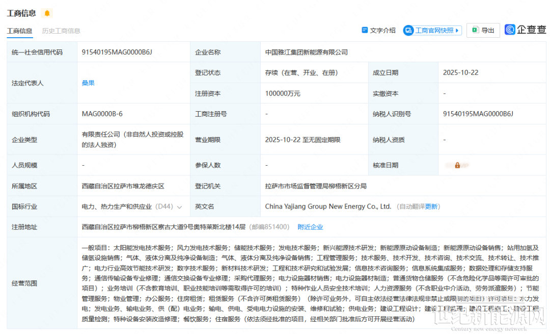10月22日,中国雅江集团新能源有限公司成立,法定代表人为桑果,注册资本10亿人民币。公司经营范围包含储能技术服务;太阳能发电技术服务;风力发电技术服务;发电技术服务等。
