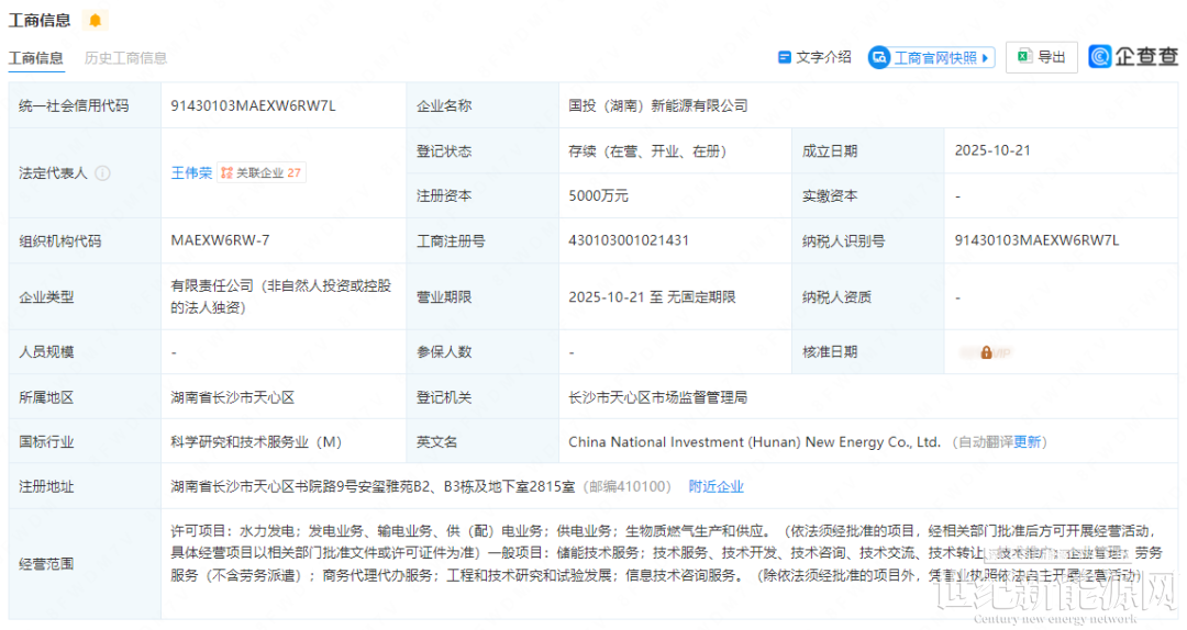 日前,国投电力又落下一子,于10月21日成立国投(湖南)新能源有限公司,注册资本5000万,其营业范围包括储能技术服务业务,聚焦传统能源与储能的协同发展。