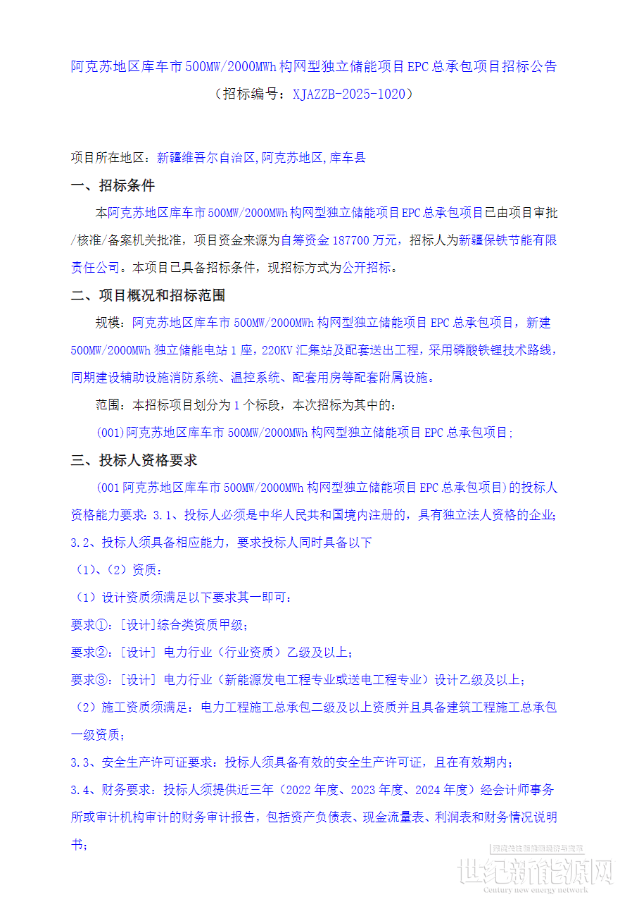10月24日,新疆保铁节能有限责任公司公开招标500MW/2GWh构网型独立储能EPC项目,项目位于新疆维吾尔自治区阿克苏地区库车市,项目资金来源为自筹资金187700万元。