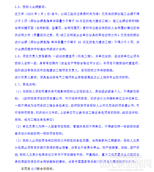 要求投标人近三年已完成的单体容量大于等于50兆瓦的电力建设工程的业绩不得少于2项。本项目允许联合体投标。