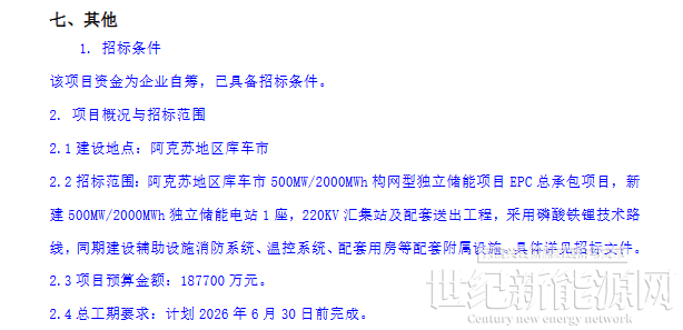 该项目新建500MW/2GWh独立储能电站1座,220KV汇集站及配套送出工程,采用磷酸铁锂技术路线同期建设辅助设施消防系统、温控系统、配套用房等配套附属设施。该项目采用磷酸铁锂技术路线同期建设辅助设施消防系统、温控系统、配套用房等配套附属设施。总工期计划2026年6月30日前完成。