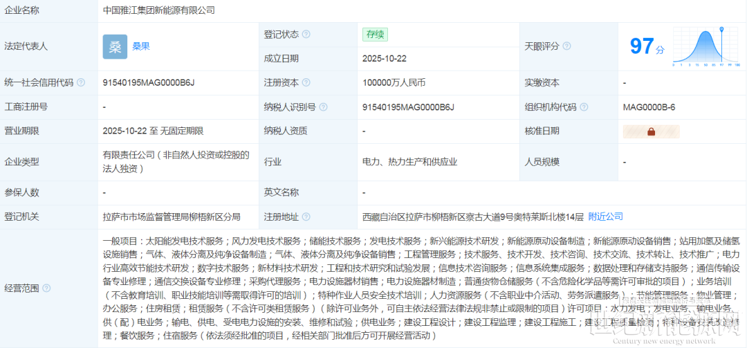 10月22日,中国雅江集团新能源有限公司成立,法定代表人为桑果,注册资本10亿人民币。