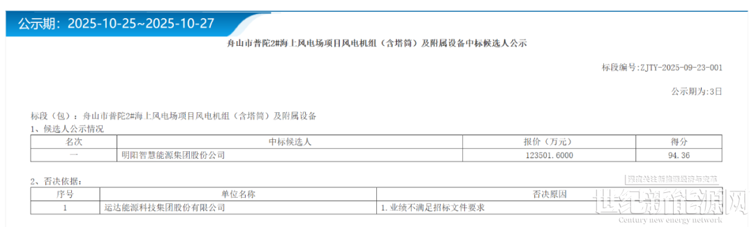 10月24日,浙能集团智能供应链一体化平台发布《舟山市普陀2#海上风电场项目风电机组(含塔筒)及附属设备中标候选人公示》的公告。