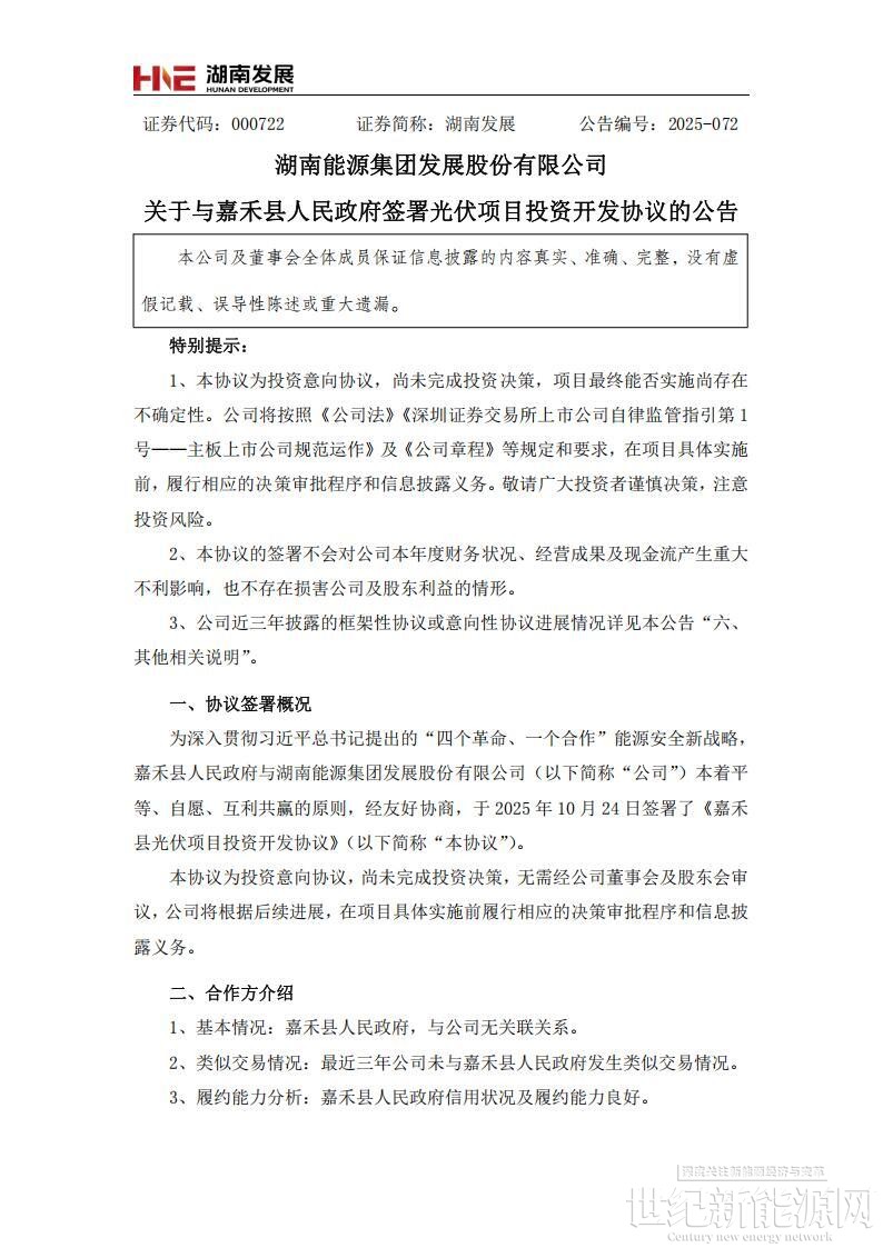 公告指出,为深入贯彻习近平总书记提出的“四个革命、一个合作”能源安全新战略,嘉禾县人民政府与湖南能源集团发展股份有限公司本着平等、自愿、互利共赢的原则,经友好协商,于2025年10月24日签署了《嘉禾县光伏项目投资开发协议》。