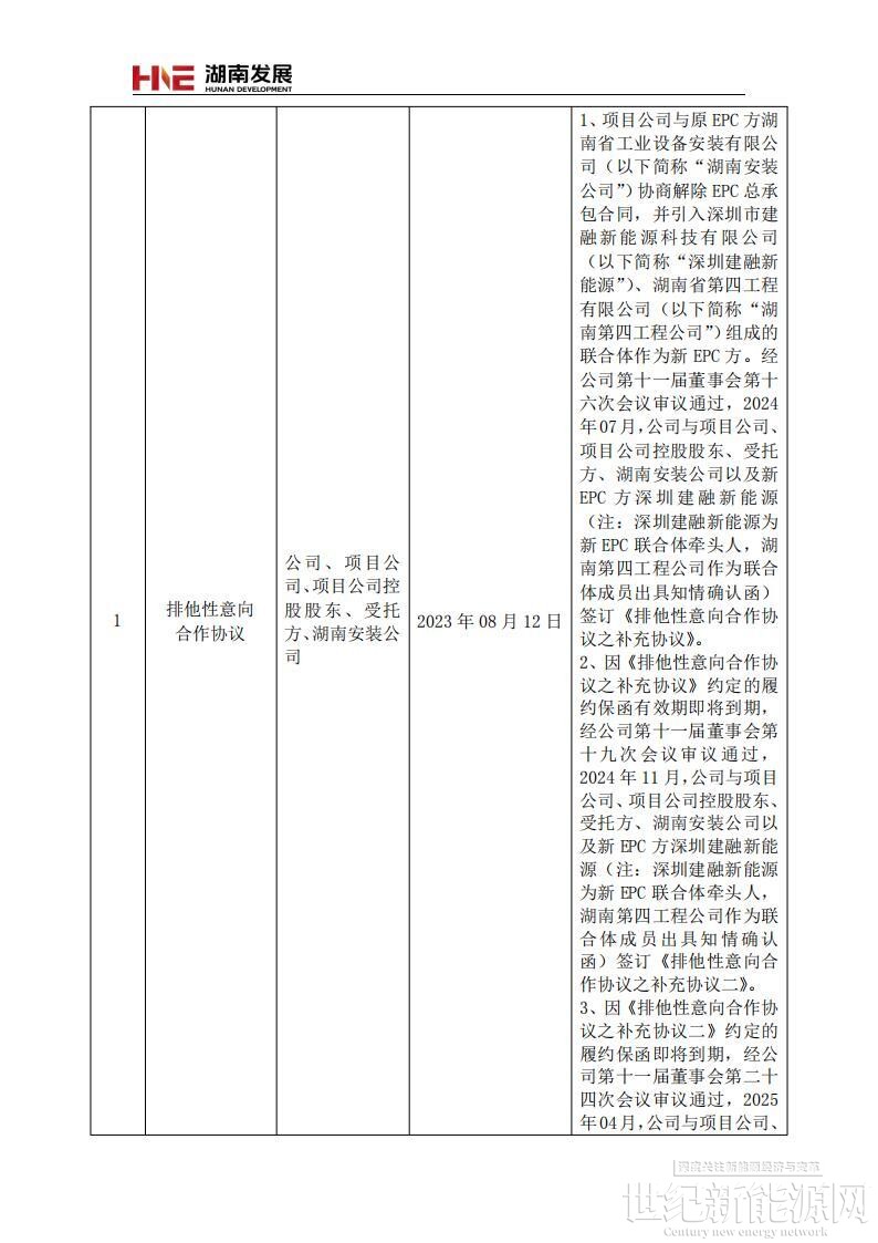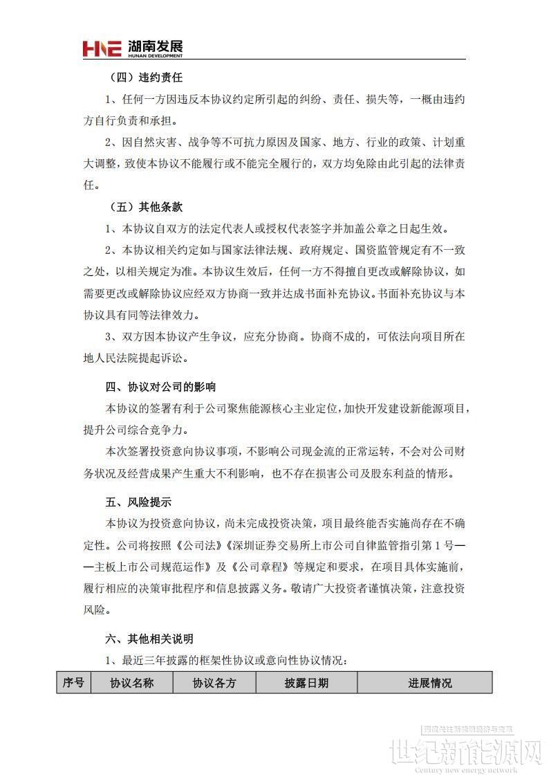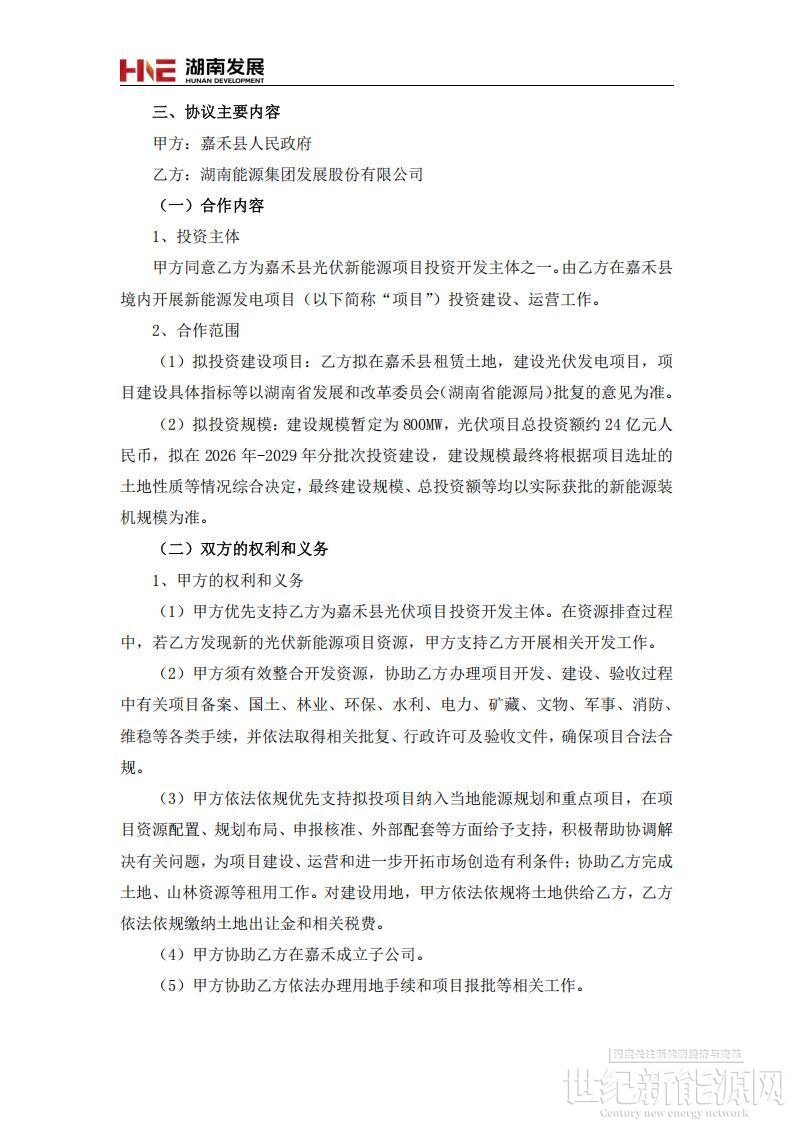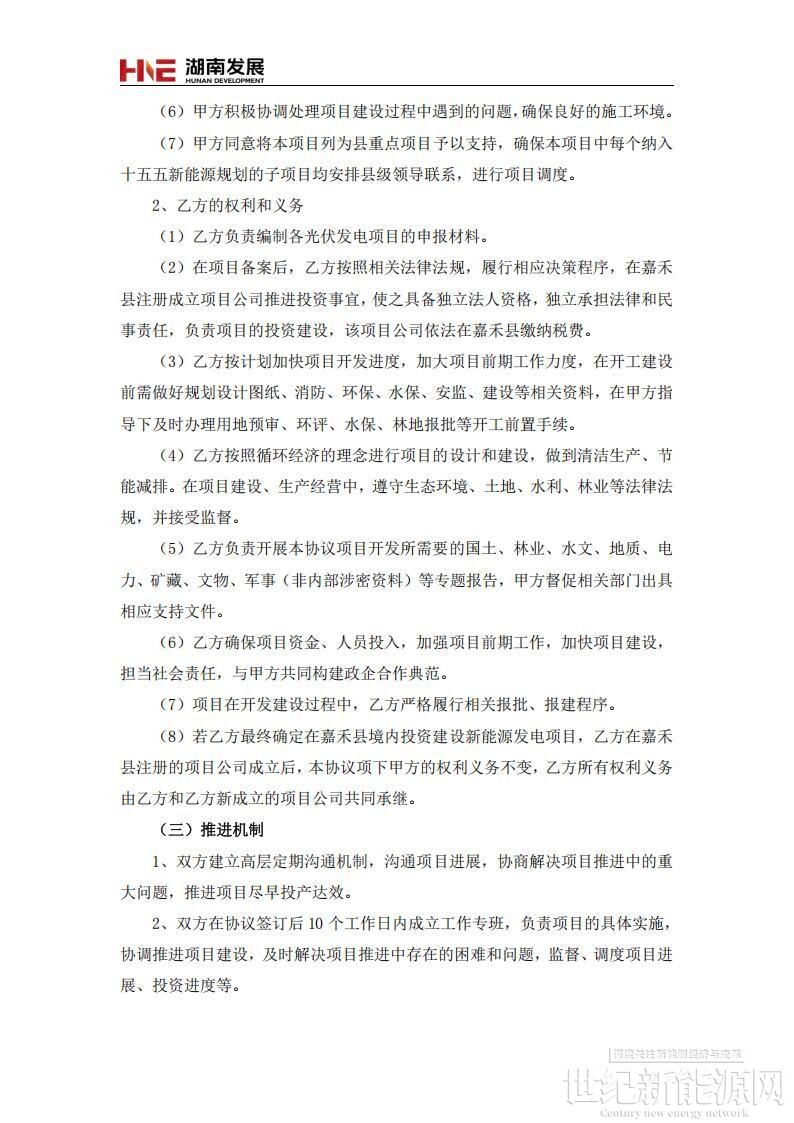 根据协议,湖南发展在嘉禾县租赁土地,建设光伏发电项目,项目建设具体指标等以湖南省发展和改革委员会(湖南省能源局)批复的意见为准。