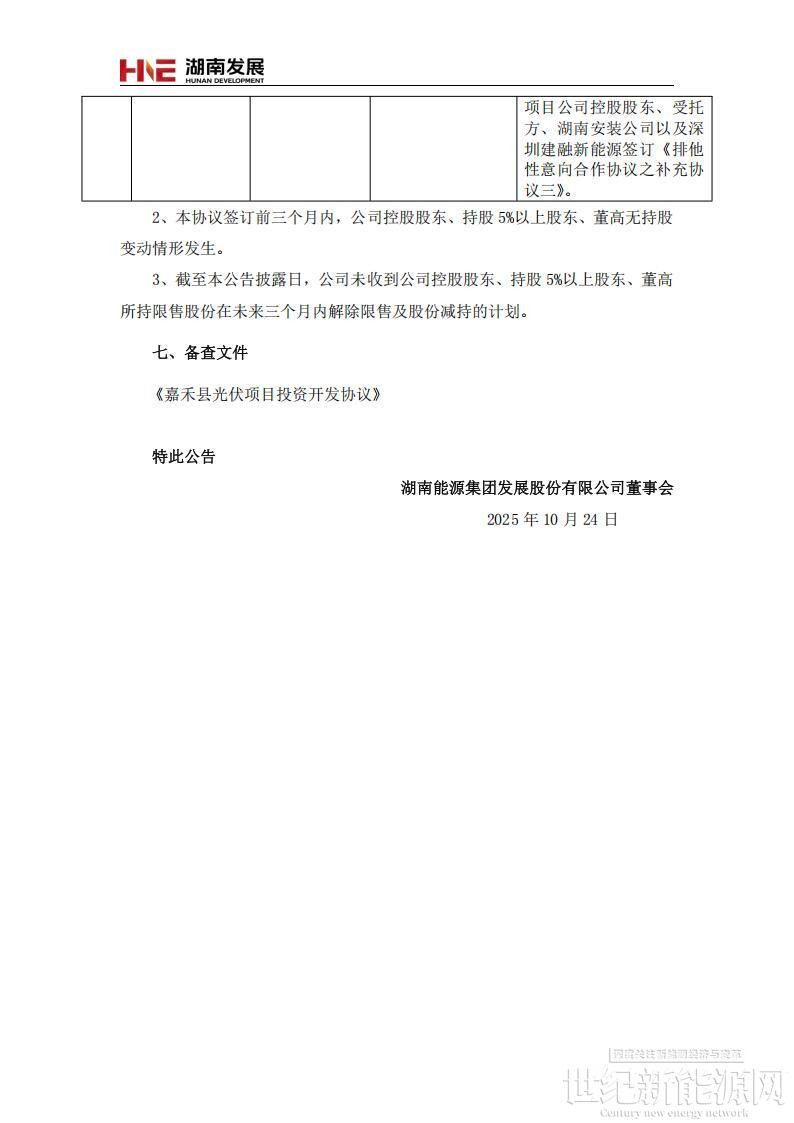 10月25日,湖南发展发布关于与嘉禾县人民政府签署光伏项目投资开发协议的公告。