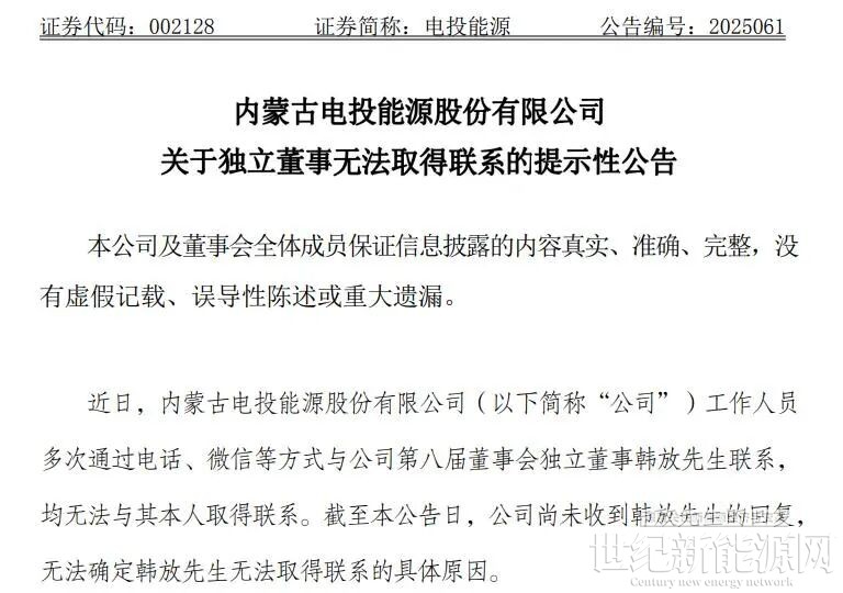 10月24日,国家电力投资集团旗下电投能源发布关于独立董事无法取得联系的提示性公告称,近日,公司工作人员多次通过电话、微信等方式与公司第八届董事会独立董事韩放联系,均无法与其本人取得联系。截至公告日,公司尚未收到韩放的回复,无法确定韩放无法取得联系的具体原因。