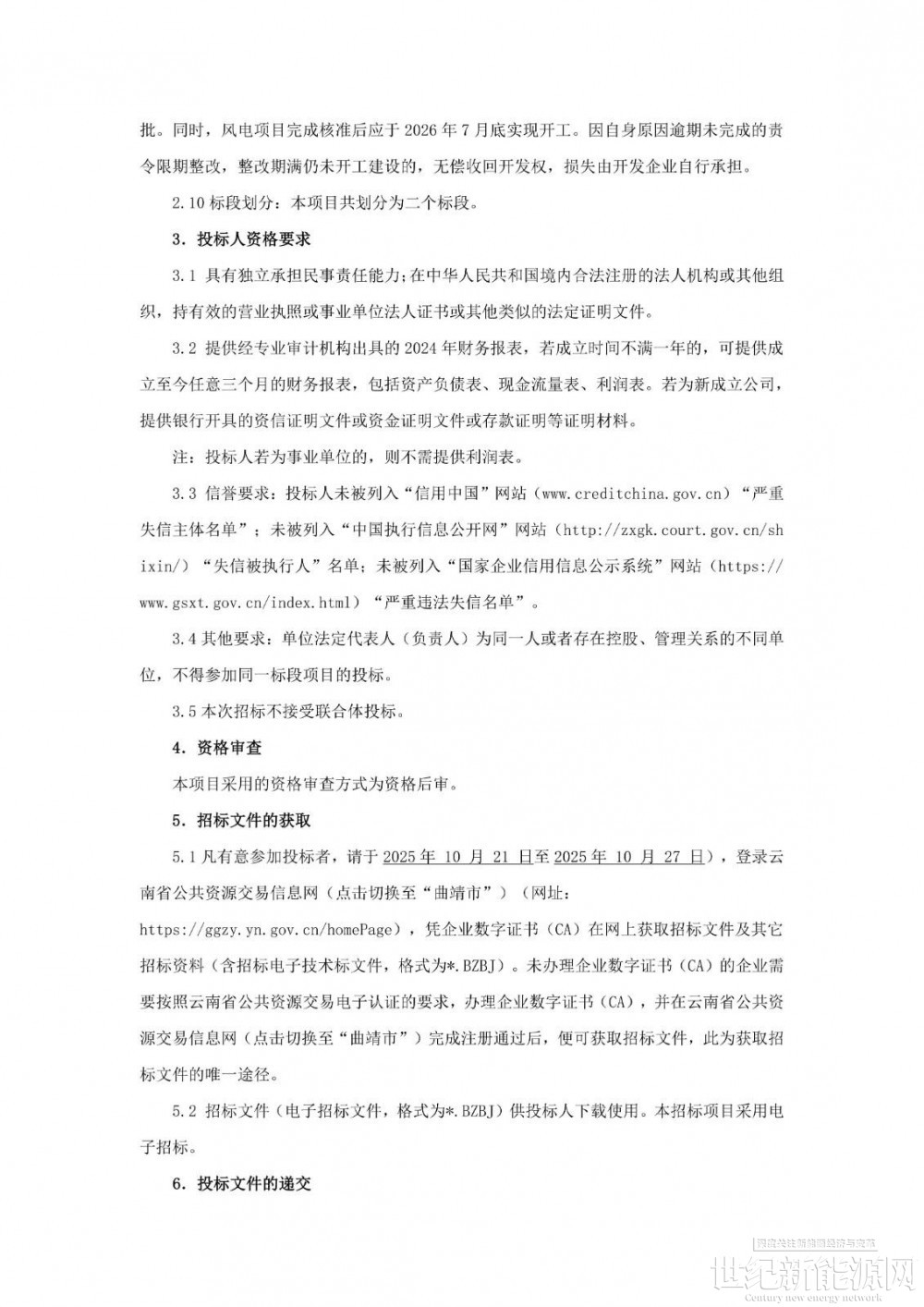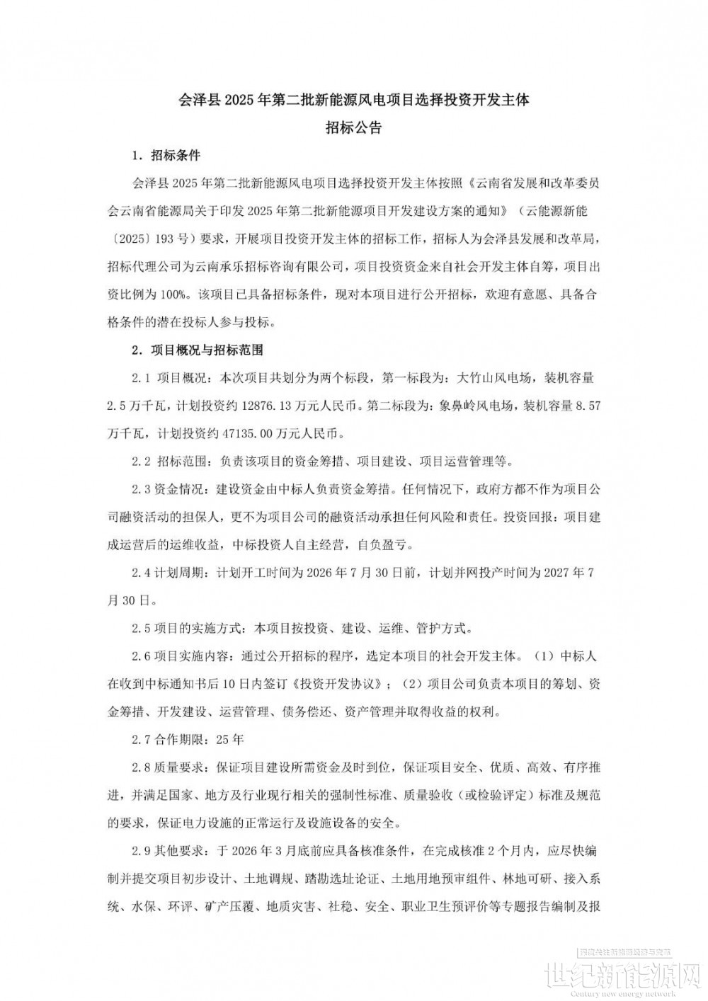 10月21日,云南会泽县2025年第二批新能源风电项目选择投资开发主体招标公告发布。