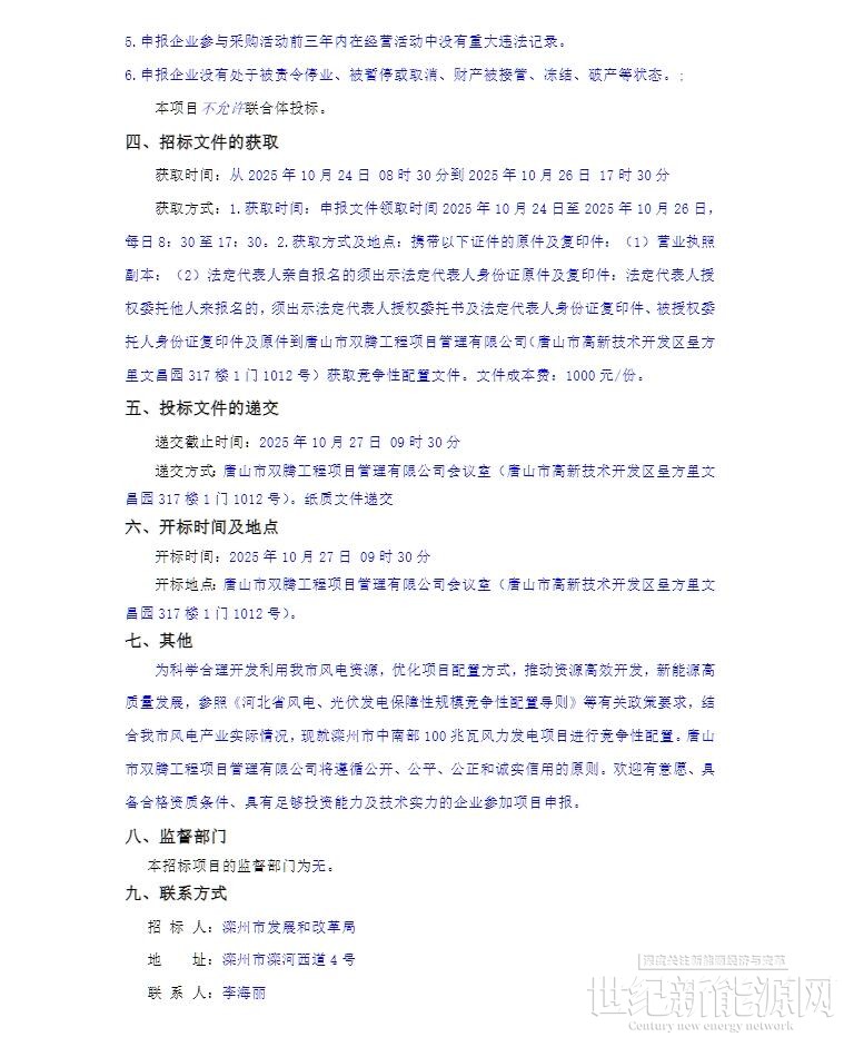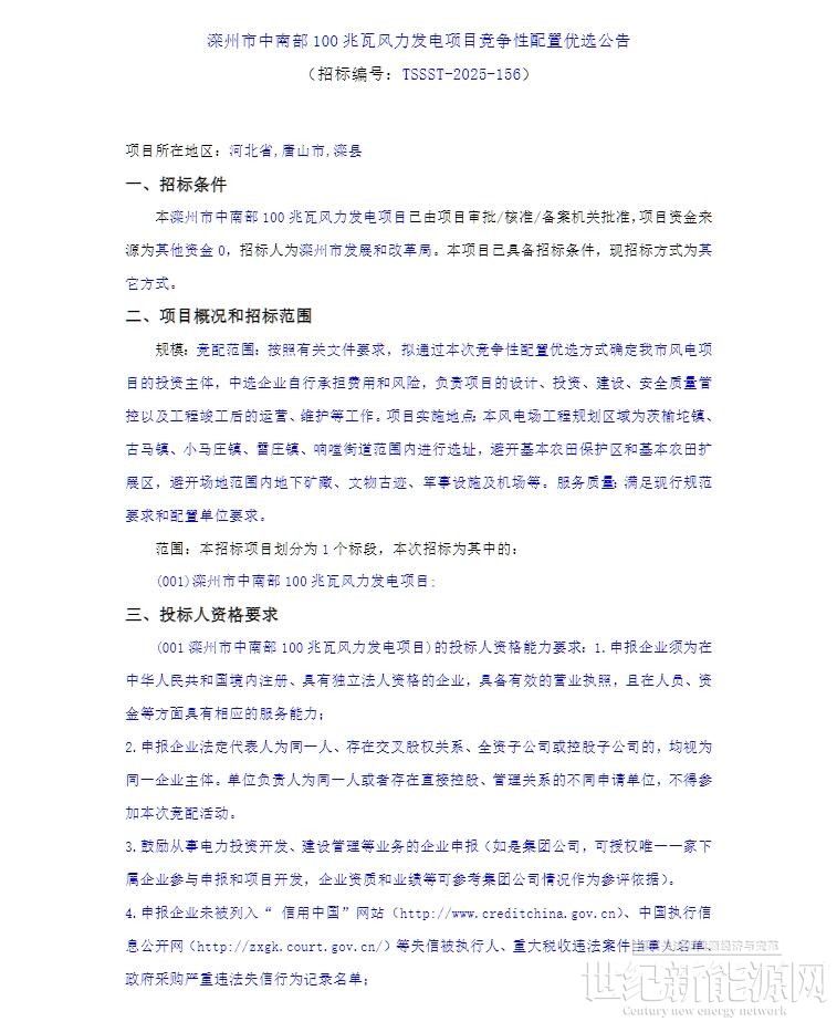 公告显示,按照有关文件要求,拟通过本次竞争性配置优选方式确定滦州市风电项目的投资主体,中选企业自行承担费用和风险,负责项目的设计、投资、建设、安全质量管控以及工程竣工后的运营、维护等工作。