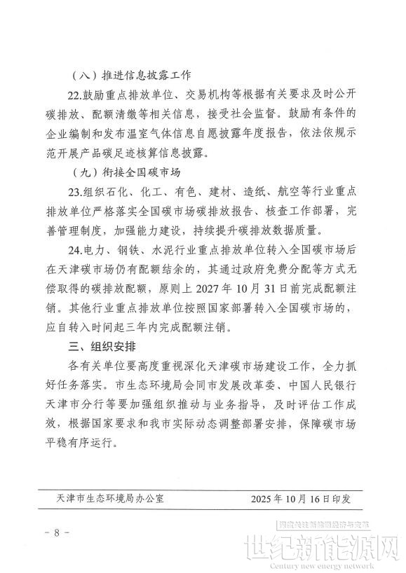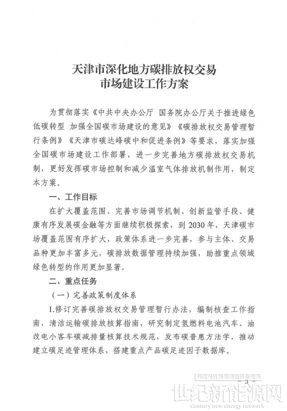 近日,天津市生态环境局 市发展改革委 中国人民银行天津市分行关于印发《天津市深化地方碳排放权交易市场建设工作方案》的通知。
