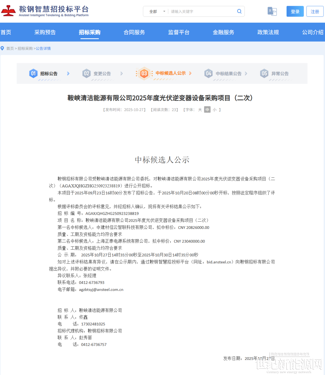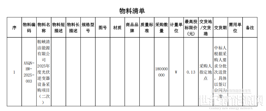 10月27日,鞍峡清洁能源有限公司2025年度光伏逆变器设备采购项目(二次)中标候选人公示。