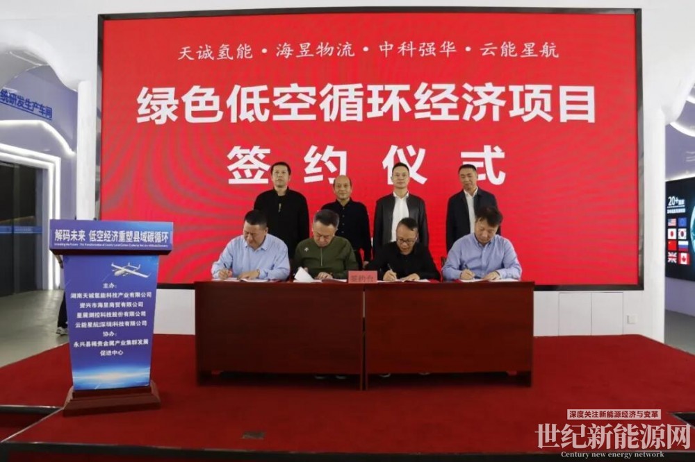 研讨会最后湖南天诚氢能、资兴海昱商贸、中科强华、云能星航四方举行了签约仪式,各方代表在与会嘉宾的见证下签署合作协议,标志着这一创新模式从理论探讨迈向实践应用的新阶段。此次签约将进一步促进各方在技术研发、产业应用等方面的深度合作,为县域绿色低碳发展提供可复制、可推广的实践案例。