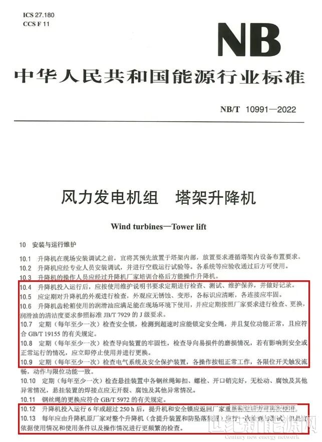 中华人民共和国能源行业标准《风力发电机组 塔架升降机》(NB/T 10991—2022)以及EN 81-44、GB/T 26557等标准,均明确要求承载人员的升降设备必须定期进行全面检修。