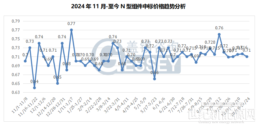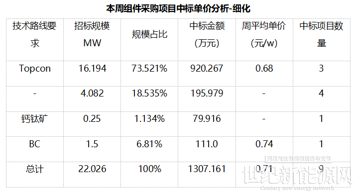 本周光伏组件采购中标规模达22.026MW,总中标金额1307.161万元,平均中标单价为0.71元/W,中标数量9个。