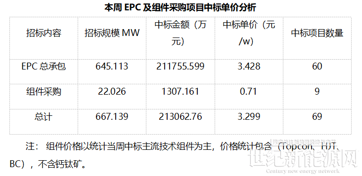 本周光伏EPC总承包中标规模达645.113MW,总中标金额211755.599万元,平均中标单价为3.428元/W,中标数量60个。