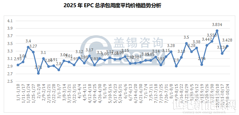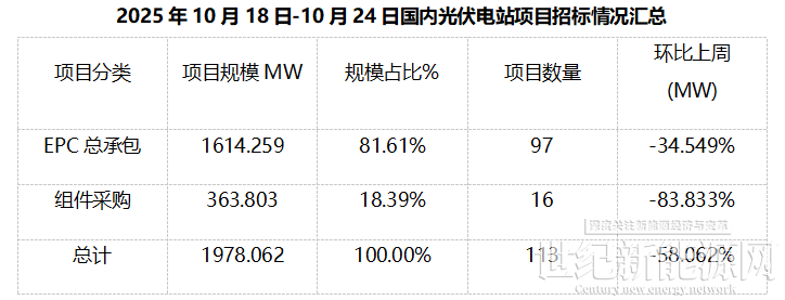 根据Gessey盖锡咨询统计,2025年10月18日-10月24日累计光伏招标项目为113个,项目规模合计为1978.062MW。光伏组件采购招标项目为16个,招标规模为363.803MW,环比上周-83.833%。EPC总承包招标项目为97个,招标规模为1614.259MW,,环比上周-34.549%。
