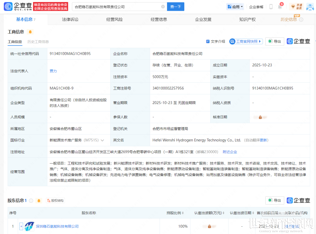 氢能观察从企查查获悉,10月23日,合肥稳石氢能科技有限责任公司成立,法定代表人贾力,注册资本5000万元。