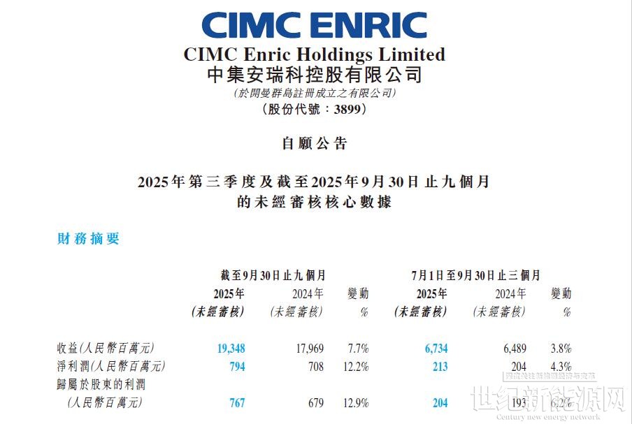 中集安瑞科控股有限公司及其附属公司(统称“中集安瑞科”或“集团”)(股份代号:3899.HK)今天欣然公布2025年三季度营运数据。2025年前三季度,集团收入同比增长7.7%至约人民币193.5亿元(人民币,下同);归母净利润稳定持续增长达7.7亿元,同比提升12.9%。